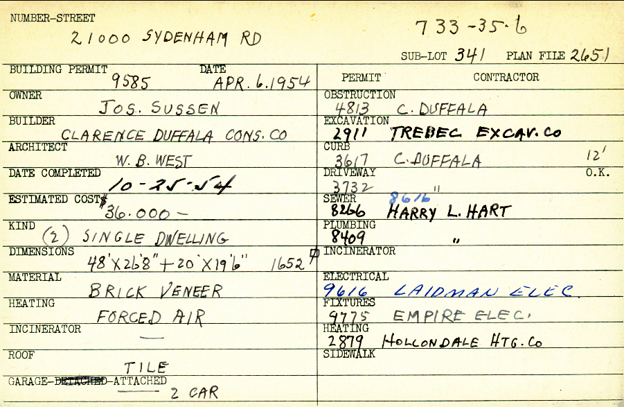 21000 Sydenham Road Shaker Heights, OH 44122 PARCEL ID: 733-35-006 Building Permit Date: 04-06-1954 Plan File Number: 2651 Microfilm Roll: Roll #37 Neighborhood: Mercer Owner: Sussen, Joseph Builder: Clarence Duffala Construction Company Architect: West, W. B. Estimated Cost: 36000 Date Completed: 10-25-1954 Kind: Single, Single Residence or Dwelling (2) Material: Brick Veneer Heating: Forced Air Roof: Tile Garage: attached 2 car |