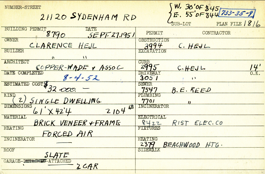 21120 Sydenham Road Shaker Heights, OH 44122 PARCEL ID: 733-35-009 Building Permit Date: 09-27-1951 Plan File Number: 1816 all scanned Microfilm Roll: Roll027 Neighborhood: Mercer Owner: Hejl, Clarence Builder: Hejl, Clarence Architect: Copper, Wade and Associates Estimated Cost: 32000 Date Completed: 08-04-1952 Kind: Single, Single Residence or Dwelling (2) Material: Brick Veneer and Frame Heating: Forced Air Roof: Slate Garage: attached 2 car |
