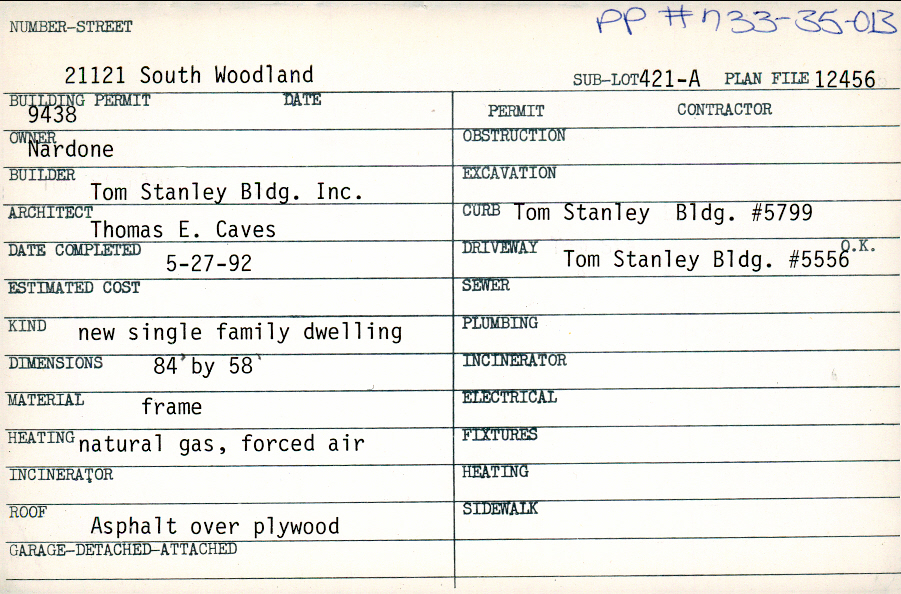 21121 South Woodland Road Shaker Heights, OH 44122 PARCEL ID: 733-35-013 Plan File Number: 12456 Microfilm Roll: NewRoll#13 Neighborhood: Mercer Owner: Nardone Builder: Tom Stanley Building Inc. Architect: Caves, Thomas E. Date Completed: 05-27-1992 Kind: Single, Single Residence or Dwelling Material: Frame Heating: Forced Air - Gas Roof: Asphalt Card Available: Yes |