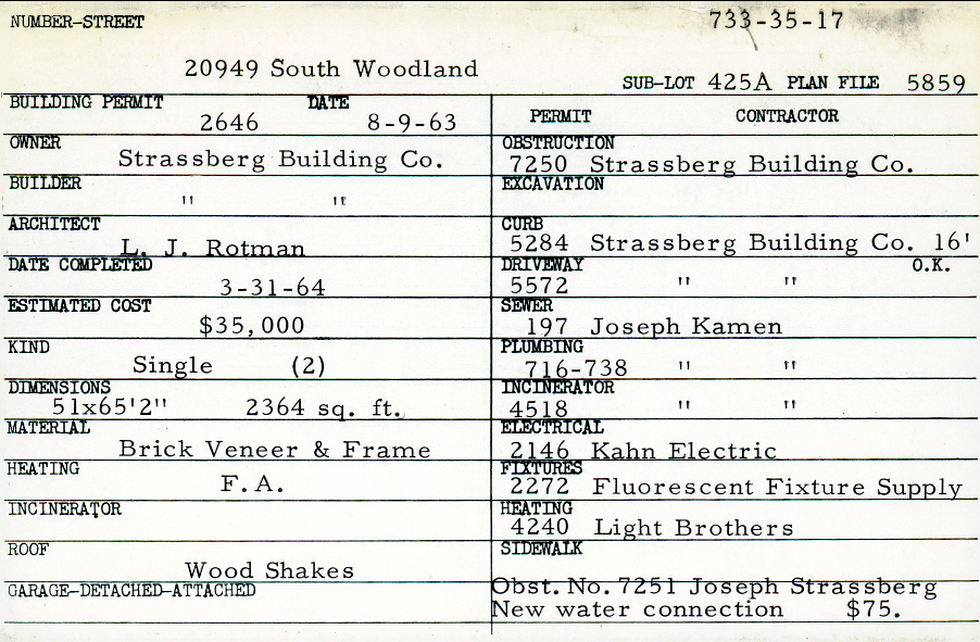 20949 South Woodland Road Shaker Heights, OH 44122 PARCEL ID: 733-35-017 Building Permit Date: 08-09-1963 Plan File Number: 5859 Microfilm Roll: Roll#79 Neighborhood: Mercer Owner: Strassberg Building Company Builder: Strassberg Building Company Architect: Rotman, L. J. Estimated Cost: 35000 Date Completed: 03-31-1964 Kind: Single, Single Residence or Dwelling (2) Material: Brick Veneer and Frame Heating: Forced Air Roof: Wood Shakes |
