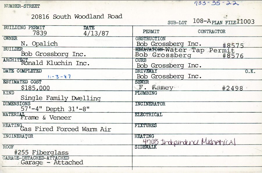 20816 South Woodland Road Shaker Heights, OH 44122 PARCEL ID: 733-35-022 Building Permit Date: 04-13-1987 Plan File Number: 11003*, 12348 Microfilm Roll: NewRoll#6, NewRoll#12 Neighborhood: Mercer Owner: Opalich, N. Builder: Bob Grossberg Inc. Architect: Ronald Kluchin Inc. Estimated Cost: 185000 Date Completed: 11-03-1987 Kind: Single, Single Residence or Dwelling Material: Frame and Veneer Heating: Forced Air - Gas Garage: attached |