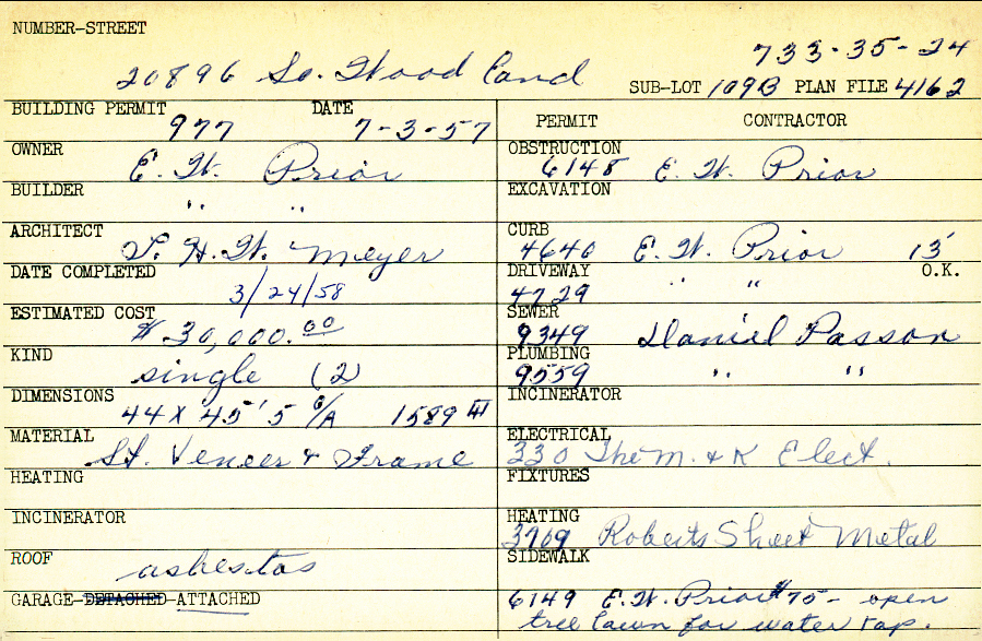 20896 South Woodland Road Shaker Heights, OH 44122 PARCEL ID: 733-35-024 Building Permit Date: 07-03-1957 Plan File Number: 4162, 5313 Microfilm Roll: Roll#61, Roll#73 Neighborhood: Mercer Owner: Prior, E. W. Builder: Prior, E. W. Architect: Meyer, L. H. W. Estimated Cost: 30000 Date Completed: 03-24-1958 Kind: Single, Single Residence or Dwelling (2) Material: Stone Veneer and Frame Roof: Asbestos Garage: attached |