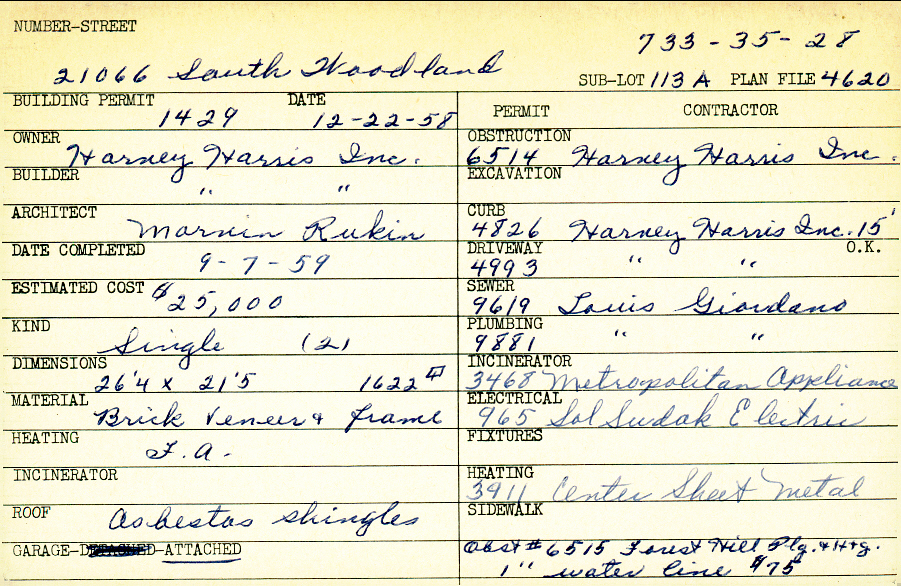 21066 South Woodland Road Shaker Heights, OH 44122 PARCEL ID: 733-35-028 Building Permit Date: 12-22-1958 Plan File Number: 4620, 10109, 10305 Microfilm Roll: Roll#65, NewRoll#2, NewRoll#3 Neighborhood: Mercer Owner: Harvey Harris Inc. Builder: Harvey Harris Inc. Architect: Rukin, Marvin Estimated Cost: 25000 Date Completed: 09-07-1959 Kind: Single, Single Residence or Dwelling (2) Material: Brick Veneer and Frame Heating: Forced Air Roof: Asbestos Shingles Garage: attached |