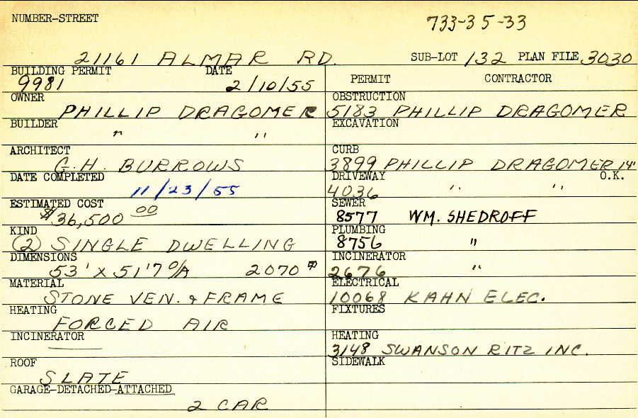 21161 Almar Drive Shaker Heights, OH 44122 PARCEL ID: 733-35-033 Building Permit Date: 02-10-1955 Plan File Number: 3030 Microfilm Roll: Roll#43 Neighborhood: Mercer Owner: Dragomer, Phillip Builder: Dragomer, Phillip Architect: Burrows, G. H. Estimated Cost: 36500 Date Completed: 11-23-1955 Kind: Single, Single Residence or Dwelling (2) Material: Stone Veneer and Frame Heating: Forced Air Roof: Slate Garage: attached 2 car |
