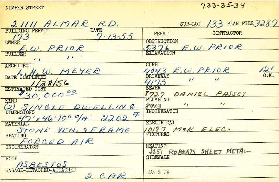 21111 Almar Drive Shaker Heights, OH 44122 PARCEL ID: 733-35-034 Building Permit Date: 07-13-1955 Plan File Number: 3287 Microfilm Roll: Roll#48 Neighborhood: Mercer Owner: Prior, E. W. Builder: Prior, E. W. Architect: Meyer, L. H. W. Estimated Cost: 30000 Date Completed: 01-28-1956 Kind: Single, Single Residence or Dwelling (2) Material: Stone Veneer and Frame Heating: Forced Air Roof: Asbestos Garage: attached 2 car |