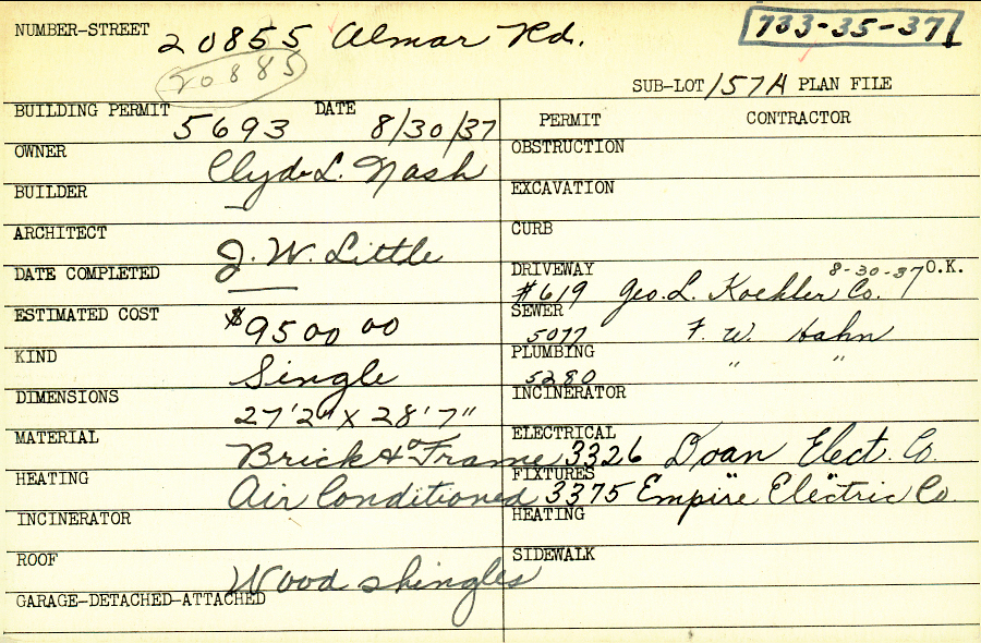 20855 Almar Drive Shaker Heights, OH 44122 PARCEL ID: 733-35-037 Building Permit Date: 08-30-1937 Plan File Number: 1210 scanned, 6949 Microfilm Roll: Roll014, Roll#90 Neighborhood: Mercer Owner: Nash, Clyde L. Architect: Little, John W. Estimated Cost: 9500 Kind: Single, Single Residence or Dwelling Material: Brick and Frame Heating: Air Conditioned Roof: Wood Shingle |