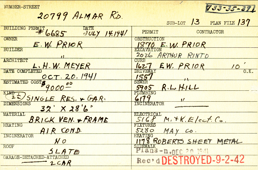 20799 Almar Drive Shaker Heights, OH 44122 PARCEL ID: 733-35-039 Building Permit Date: 07-14-1941 Plan File Number: 137 Neighborhood: Mercer Owner: Prior, E. W. Builder: Prior, E. W. Architect: Meyer, L. H. W. Estimated Cost: 9000 Date Completed: 10-20-1941 Kind: Single Dwelling and Garage (2) Material: Brick Veneer and Frame Heating: Air Conditioned Roof: Slate Garage: detached 2 car |