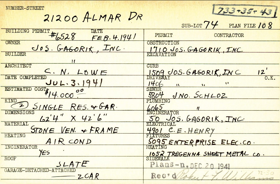 21200 Almar Drive Shaker Heights, OH 44122 PARCEL ID: 733-35-043 Building Permit Date: 02-04-1941 Plan File Number: 108, 5471 Microfilm Roll: Roll#74 Neighborhood: Mercer Owner: Joseph Gagorik, Inc. Builder: Joseph Gagorik, Inc. Architect: Lowe, C. N. Estimated Cost: 14000 Date Completed: 07-03-1941 Kind: Single Dwelling and Garage (2) Material: Stone Veneer and Frame Heating: Air Conditioned Roof: Slate Garage: attached 2 car |