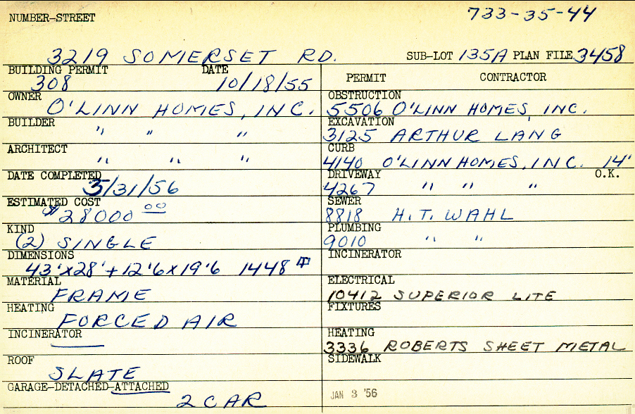 3219 Somerset Drive Shaker Heights, OH 44122 PARCEL ID: 733-35-044 Building Permit Date: 10-18-1955 Plan File Number: 3458 Microfilm Roll: Roll#51 Neighborhood: Mercer Owner: O'Linn Homes, Inc. Builder: O'Linn Homes, Inc. Architect: O'Linn Homes, Inc. Estimated Cost: 28000 Date Completed: 05-31-1956 Kind: Single, Single Residence or Dwelling (2) Material: Frame Heating: Forced Air Roof: Slate Garage: attached 2 car |