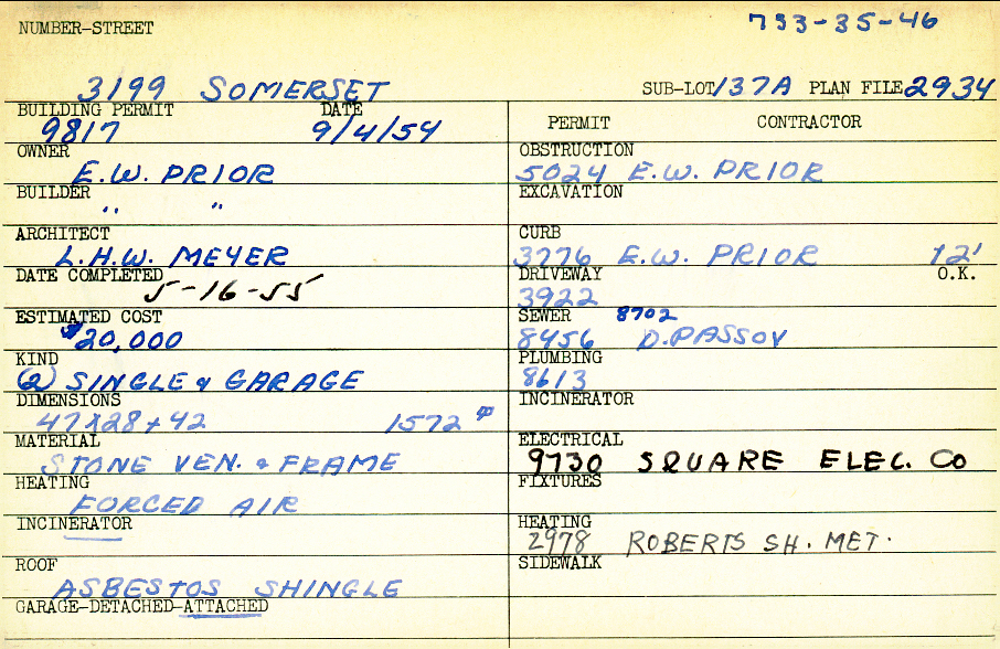 3199 Somerset Drive Shaker Heights, OH 44122 PARCEL ID: 733-35-046 Building Permit Date: 09-04-1954 Plan File Number: 2934, 4436 Microfilm Roll: Roll#42, Roll#50, 4436 Neighborhood: Mercer Owner: Prior, E. W. Builder: Prior, E. W. Architect: Meyer, L. H. W. Estimated Cost: 20000 Date Completed: 05-16-1955 Kind: Single Dwelling and Garage (2) Material: Stone Veneer and Frame Heating: Forced Air Roof: Asbestos Shingles Garage: attached |