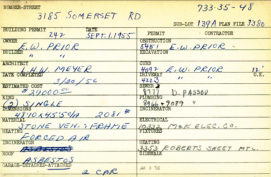 3185 Somerset Drive Shaker Heights, OH 44122 PARCEL ID: 733-35-048 Building Permit Date: 09-01-1955 Plan File Number: 3380, 4211 all scanned Microfilm Roll: Roll#49, Roll#61 Neighborhood: Mercer Owner: Prior, E. W. Builder: Prior, E. W. Architect: Meyer, L. H. W. Estimated Cost: 29000 Date Completed: 03-30-1956 Kind: Single, Single Residence or Dwelling (2) Material: Stone Veneer and Frame Heating: Forced Air Roof: Asbestos Garage: attached 2 car |
