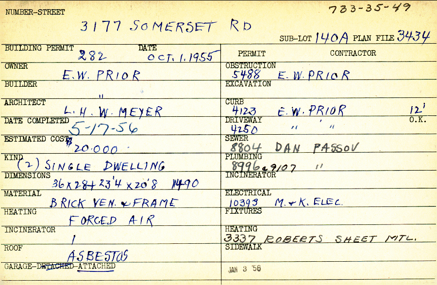 3177 Somerset Drive Shaker Heights, OH 44122 PARCEL ID: 733-35-049 Building Permit Date: 10-01-1955 Plan File Number: 3434 Microfilm Roll: Roll#50 Neighborhood: Mercer Owner: Prior, E. W. Builder: Prior, E. W. Architect: Meyer, L. H. W. Estimated Cost: 20000 Date Completed: 05-17-1956 Kind: Single, Single Residence or Dwelling (2) Material: Brick Veneer and Frame Heating: Forced Air Roof: Asbestos Garage: attached |