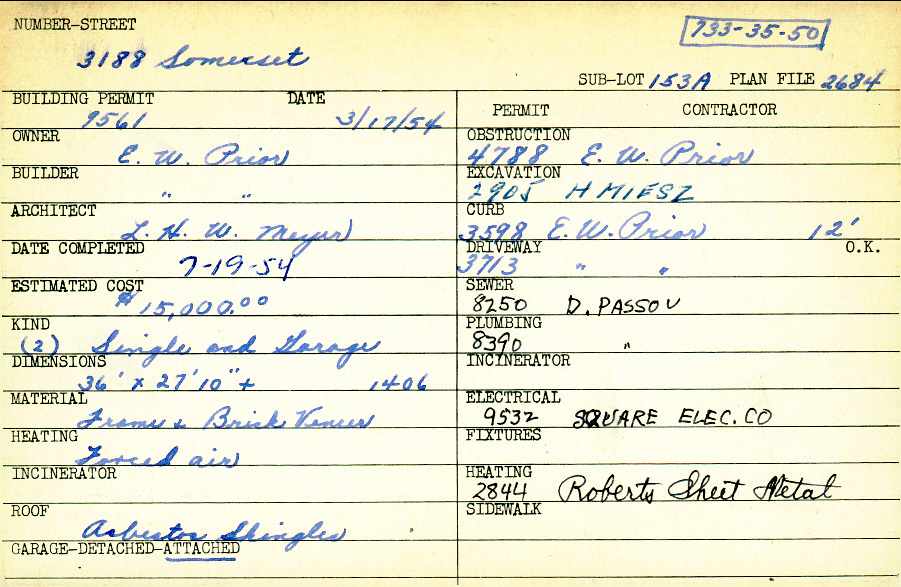 3188 Somerset Drive Shaker Heights, OH 44122 PARCEL ID: 733-35-050 Building Permit Date: 03-17-1954 Plan File Number: 2684 Microfilm Roll: Roll #37 Neighborhood: Mercer Owner: Prior, E. W. Builder: Prior, E. W. Architect: Meyer, L. H. W. Estimated Cost: 15000 Date Completed: 07-19-1954 Kind: Single Dwelling and Garage (2) Material: Frame and Brick Veneer Heating: Forced Air Roof: Asbestos Shingles Garage: attached |