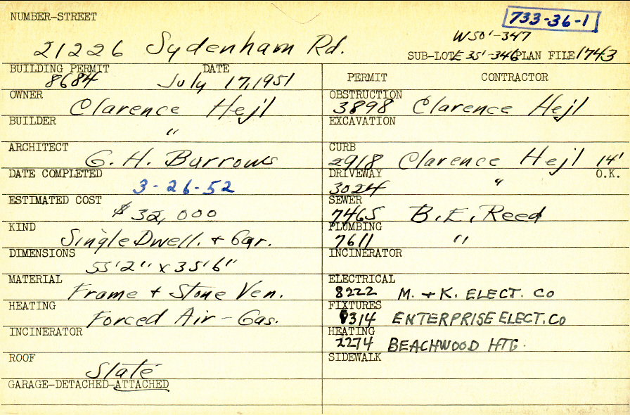 21226 Sydenham Road Shaker Heights, OH 44122 PARCEL ID: 733-36-001 Building Permit Date: 07-17-1951 Plan File Number: 1743 scanned, 7249, 8257 Microfilm Roll: Roll26A, Roll#92 Neighborhood: Mercer Owner: Hejl, Clarence Builder: Hejl, Clarence Architect: Burrows, G. H. Estimated Cost: 32000 Date Completed: 03-26-1952 Kind: Single Dwelling and Garage Material: Frame and Stone Veneer Heating: Forced Air - Gas Roof: Slate Garage: attached |