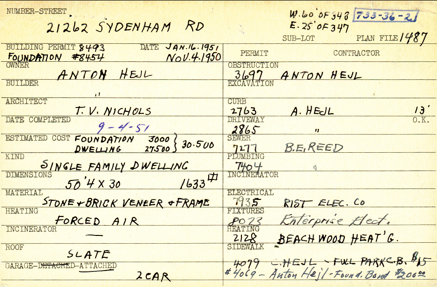 21262 Sydenham Road Shaker Heights, OH 44122 PARCEL ID: 733-36-002 Building Permit Date: 11-04-1950 Plan File Number: 1487 scanned, 6750 Microfilm Roll: Roll017, Roll#88 Neighborhood: Mercer Owner: Hejl, Anton Builder: Hejl, Anton Architect: Nichols, T. V. Estimated Cost: 30500 Date Completed: 09-04-1951 Kind: Single, Single Residence or Dwelling Material: Stone and Brick Veneer and Frame Heating: Forced Air Roof: Slate Garage: attached 2 car |