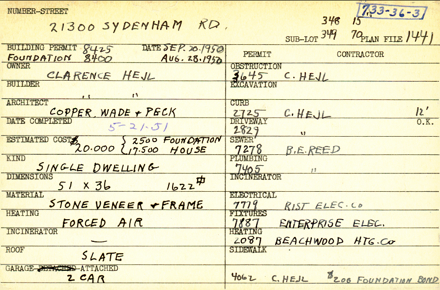 21300 Sydenham Road Shaker Heights, OH 44122 PARCEL ID: 733-36-003 Building Permit Date: 08-28-1950 Plan File Number: 1441 all scanned Microfilm Roll: Roll016 Neighborhood: Mercer Owner: Hejl, Clarence Builder: Hejl, Clarence Architect: Copper, Wade and Peck Estimated Cost: 20000 Date Completed: 05-21-1951 Kind: Single, Single Residence or Dwelling Material: Stone Veneer and Frame Heating: Forced Air Roof: Slate Garage: attached 2 car |