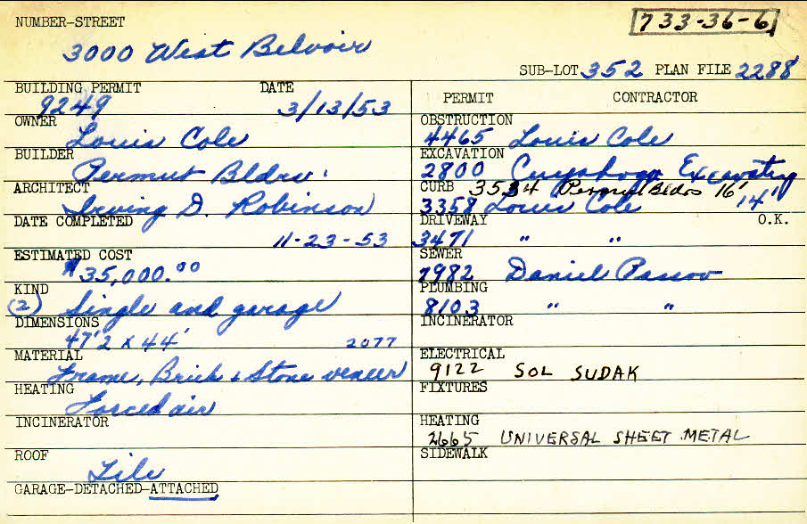 3000 West Belvoir Oval Shaker Heights, OH 44122 PARCEL ID: 733-36-006 Building Permit Date: 03-13-1953 Plan File Number: 1761 scanned, 2288 Microfilm Roll: Roll26A, Roll#34 Neighborhood: Mercer Owner: Cole, Louis Builder: Permut Builders Architect: Robinson, Irving D. Estimated Cost: 35000 Date Completed: 11-23-1953 Kind: Single Dwelling and Garage (2) Material: Frame, Brick and Stone Veneer Heating: Forced Air Roof: Tile Garage: attached |