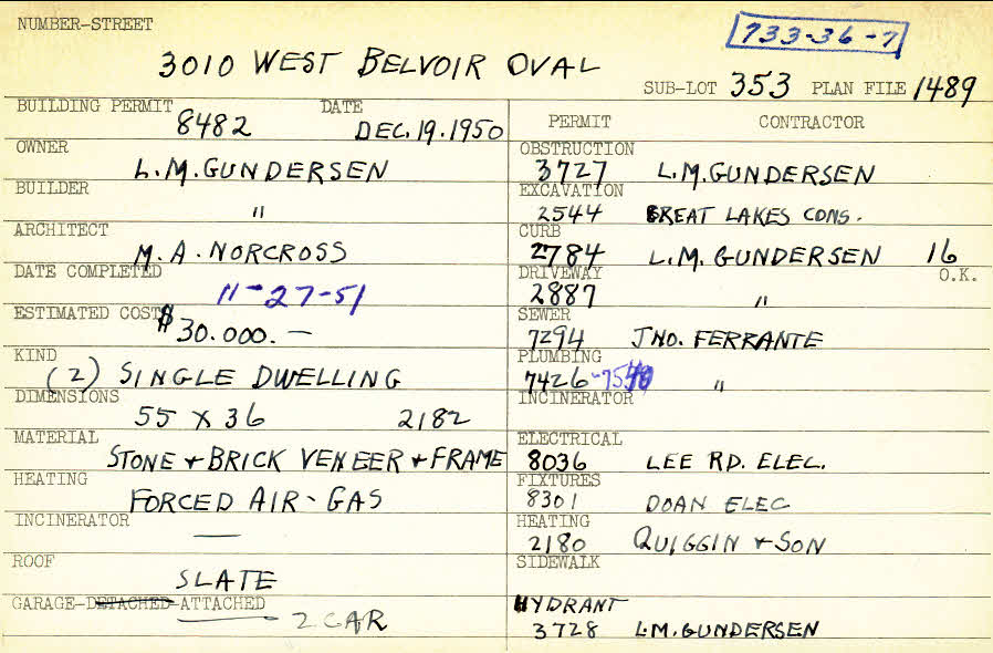 3010 West Belvoir Oval Shaker Heights, OH 44122 PARCEL ID: 733-36-007 Building Permit Date: 12-19-1950 Plan File Number: 1489 all scanned Microfilm Roll: Roll017 Neighborhood: Mercer Owner: Gundersen. L. M. Builder: Gundersen. L. M. Architect: Norcross, M. A. Estimated Cost: 30000 Date Completed: 11-27-1951 Kind: Single, Single Residence or Dwelling (2) Material: Stone and Brick Veneer and Frame Heating: Forced Air - Gas Roof: Slate Garage: attached 2 car |