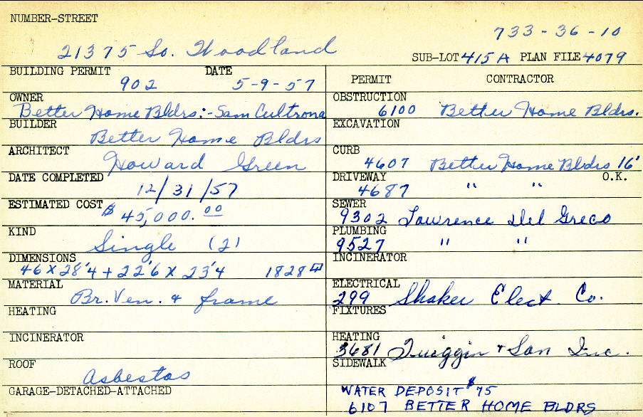 21375 South Woodland Road Shaker Heights, OH 44122 PARCEL ID: 733-36-010 Building Permit Date: 05-09-1957 Plan File Number: 4079 Microfilm Roll: Roll#59 Neighborhood: Mercer Owner: Better Home Builders - Cultrone, Sam Builder: Better Home Builders Architect: Green, Howard Estimated Cost: 45000 Date Completed: 12-31-1957 Kind: Single, Single Residence or Dwelling (2) Material: Brick Veneer and Frame Roof: Asbestos |