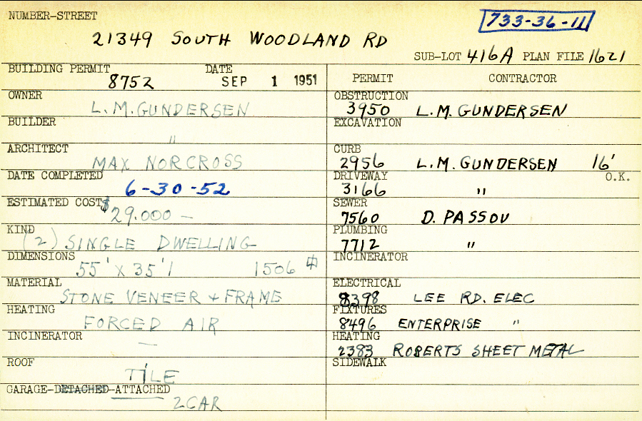 21349 South Woodland Road Shaker Heights, OH 44122 PARCEL ID: 733-36-011 Building Permit Date: 09-01-1951 Plan File Number: 1621 all scanned Microfilm Roll: Roll025 Neighborhood: Mercer Owner: Gundersen, L. M. Builder: Gundersen, L. M. Architect: Norcross, Max Estimated Cost: 29000 Date Completed: 06-30-1952 Kind: Single, Single Residence or Dwelling (2) Material: Stone Veneer and Frame Heating: Forced Air Roof: Tile Garage: attached 2 car |