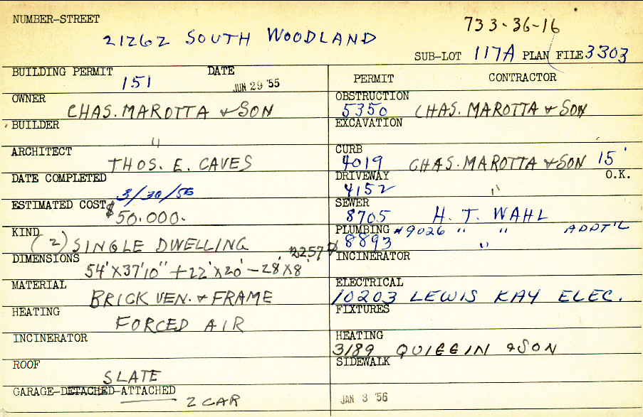 21262 South Woodland Road Shaker Heights, OH 44122 PARCEL ID: 733-36-016 Building Permit Date: 06-29-1955 Plan File Number: 3303, 12676 Microfilm Roll: Roll#48, NewRoll#14 Neighborhood: Mercer Owner: Charles Marotta and Son Builder: Charles Marotta and Son Architect: Caves, Thomas E. Estimated Cost: 50000 Date Completed: 03-30-1956 Kind: Single, Single Residence or Dwelling (2) Material: Brick Veneer and Frame Heating: Forced Air Roof: Slate Garage: attached 2 car |