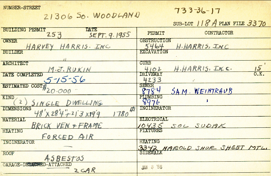 21306 South Woodland Road Shaker Heights, OH 44122 PARCEL ID: 733-36-017 Building Permit Date: 09-09-1955 Plan File Number: 3370 Microfilm Roll: Roll#48 Neighborhood: Mercer Owner: Harvey Harris Inc. Builder: Harvey Harris Inc. Architect: Rukin, M. J. Estimated Cost: 20000 Date Completed: 05-15-1956 Kind: Single, Single Residence or Dwelling (2) Material: Brick Veneer and Frame Heating: Forced Air Roof: Asbestos Garage: attached 2 car |