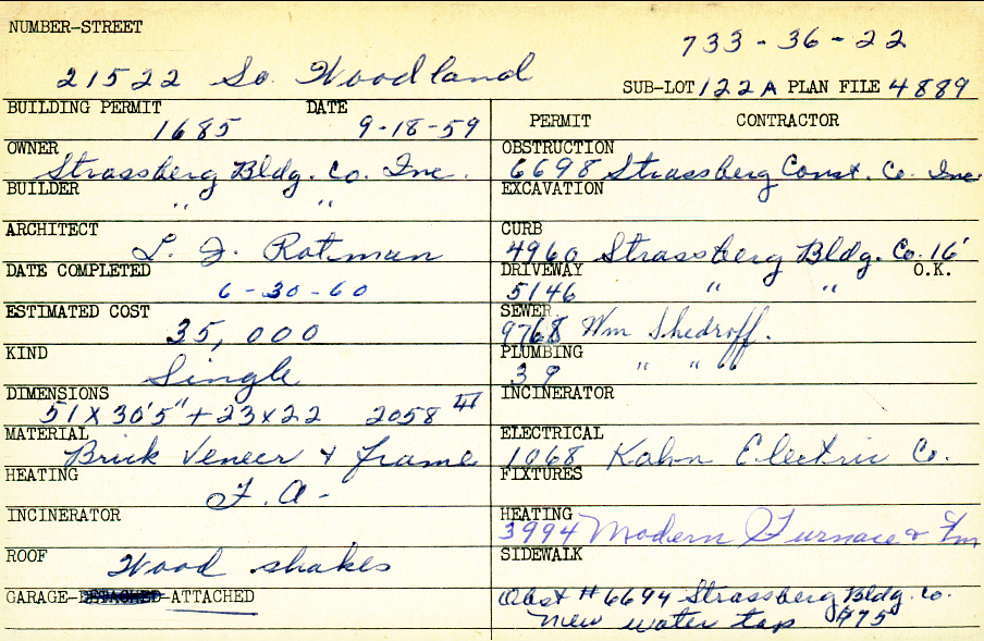 21522 South Woodland Road Shaker Heights, OH 44122 PARCEL ID: 733-36-022 Building Permit Date: 09-18-1959 Plan File Number: 4889 heating plans all scanned Microfilm Roll: Roll067 Neighborhood: Mercer Owner: Strassberg Building Company Inc. Builder: Strassberg Building Company Inc. Architect: Rotman, L. J. Estimated Cost: 35000 Date Completed: 06-30-1960 Kind: Single, Single Residence or Dwelling Material: Brick Veneer and Frame Heating: Forced Air Roof: Wood Shakes Garage: attached Blueprints: online, see link above |