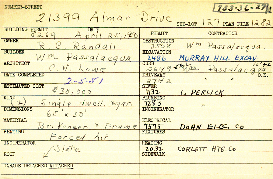 21399 Almar Drive Shaker Heights, OH 44122 PARCEL ID: 733-36-027 Building Permit Date: 04-25-1950 Plan File Number: 1282 all scanned Microfilm Roll: Roll015 Neighborhood: Mercer Owner: Randall, R. C. Builder: Passalacqua, William Architect: Lowe, C. N. Estimated Cost: 30000 Date Completed: 02-05-1951 Kind: Single Dwelling and Garage (2) Material: Brick Veneer and Frame Heating: Forced Air Roof: Slate Garage: attached |