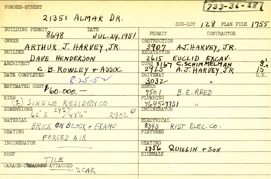 21351 Almar Drive Shaker Heights, OH 44122 PARCEL ID: 733-36-028 Building Permit Date: 07-24-1951 Plan File Number: 1755 all scanned Microfilm Roll: Roll26A Neighborhood: Mercer Owner: Harvey, Arthur J. Jr. Builder: Henderson, Dave Architect: C. B. Rowley and Associates Estimated Cost: 60000 Date Completed: 08-25-1952 Kind: Single, Single Residence or Dwelling (2) Material: Brick on Block and Frame Heating: Forced Air Roof: Tile Garage: attached 2 car |