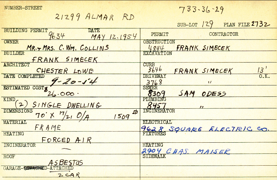 21299 Almar Drive Shaker Heights, OH 44122 PARCEL ID: 733-36-029 Building Permit Date: 05-12-1954 Plan File Number: 2732, 3655 Microfilm Roll: Roll #37, Roll#54 Neighborhood: Mercer Owner: Collins, Mr. and Mrs. C. William Builder: Simecek, Frank Architect: Lowe, Chester Estimated Cost: 26000 Date Completed: 09-20-1954 Kind: Single, Single Residence or Dwelling (2) Material: Frame Heating: Forced Air Roof: Asbestos Garage: attached 2 car |