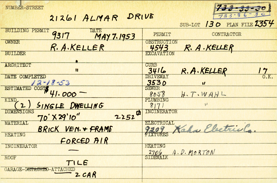 21261 Almar Drive Shaker Heights, OH 44122 PARCEL ID: 733-36-030 Building Permit Date: 05-07-1953 Plan File Number: 2354, 10513 Microfilm Roll: Roll#34, NewRoll#4 Neighborhood: Mercer Owner: Keller, Richard A. Builder: Keller, Richard A. Architect: Keller, Richard A. Estimated Cost: 41000 Date Completed: 12-18-1953 Kind: Single, Single Residence or Dwelling (2) Material: Brick Veneer and Frame Heating: Forced Air Roof: Tile Garage: attached 2 car |