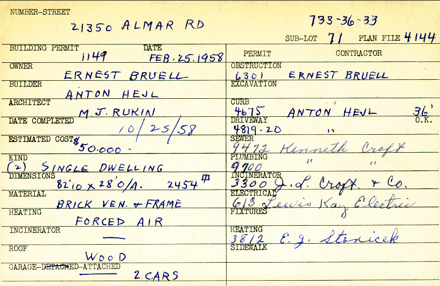 21350 Almar Drive Shaker Heights, OH 44122 PARCEL ID: 733-36-033 Building Permit Date: 02-25-1958 Plan File Number: 4144, 9159 Microfilm Roll: Roll#61, Roll#102 Neighborhood: Mercer Owner: Bruell, Ernest Builder: Hejl, Anton Architect: Rukin, M. J. Estimated Cost: 50000 Date Completed: 10-25-1958 Kind: Single, Single Residence or Dwelling (2) Material: Brick Veneer and Frame Heating: Forced Air Roof: Wood Garage: attached 2 car |