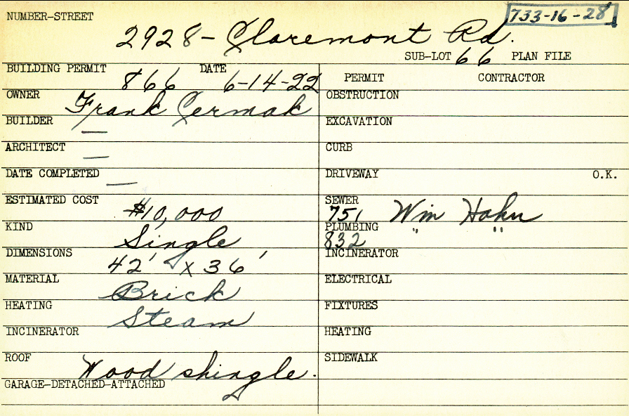 2928 Claremont Road Shaker Heights, OH 44122 PARCEL ID: 733-16-028 Building Permit Date: 06-14-1922 Plan File Number: 1661 scanned, 3706 Microfilm Roll: Roll025, Roll#51 Neighborhood: Malvern Owner: Cermak, Frank Estimated Cost: 10000 Kind: Single, Single Residence or Dwelling Material: Brick Heating: Steam Roof: Wood Shingle |