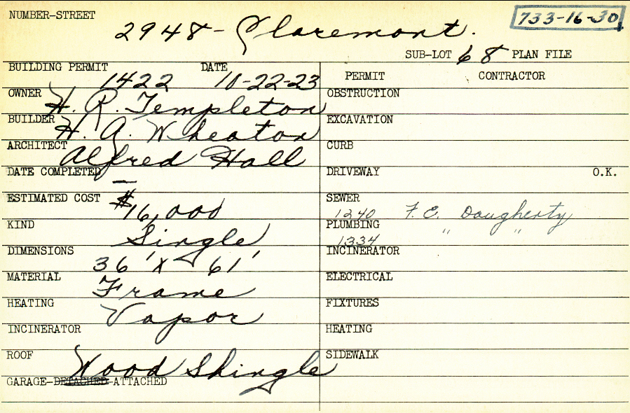 2948 Claremont Road Shaker Heights, OH 44122 PARCEL ID: 733-16-030 Building Permit Date: 10-22-1923 Plan File Number: 2639, 91-142 Microfilm Roll: Roll #37, NewRoll#1 Neighborhood: Malvern Owner: Templeton, H. R. Builder: Wheaton, H. A. Architect: Hall, Alfred Estimated Cost: 16000 Kind: Single, Single Residence or Dwelling Material: Frame Heating: Vapor Roof: Wood Shingle Garage: attached |