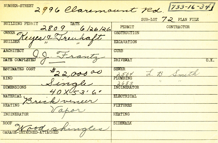 2996 Claremont Road Shaker Heights, OH 44122 PARCEL ID: 733-16-034 Building Permit Date: 06-26-1926 Plan File Number: 0 Neighborhood: Malvern Owner: Keyes and Treuhaft Builder: Keyes and Treuhaft Architect: Frantz, Irvin J. Estimated Cost: 22000 Kind: Single, Single Residence or Dwelling Material: Brick Veneer Heating: Vapor Roof: Wood Shingle |