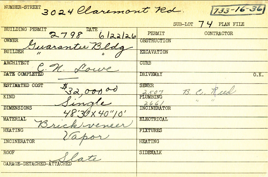 3024 Claremont Road Shaker Heights, OH 44122 PARCEL ID: 733-16-036 Building Permit Date: 06-22-1926 Plan File Number: 0 Neighborhood: Malvern Owner: Guarantee Building Builder: Guarantee Building Architect: Lowe, C. N. Estimated Cost: 32000 Kind: Single, Single Residence or Dwelling Material: Brick Veneer Heating: Vapor Roof: Slate Card Available: yes |