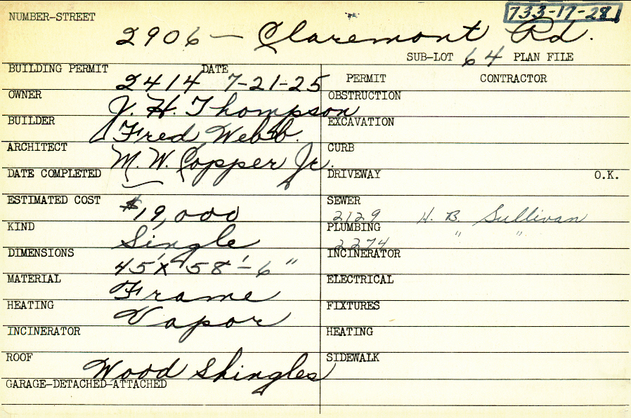 2906 Claremont Road Shaker Heights, OH 44122 PARCEL ID: 733-17-028 Building Permit Date: 07-21-1925 Plan File Number: 11747 Microfilm Roll: NewRoll#9 Neighborhood: Malvern Owner: Thompson, J. H. Builder: Webb, Fred Architect: Copper, Munroe Walker Jr. Estimated Cost: 19000 Kind: Single, Single Residence or Dwelling Material: Frame Heating: Vapor Roof: Wood Shingle |