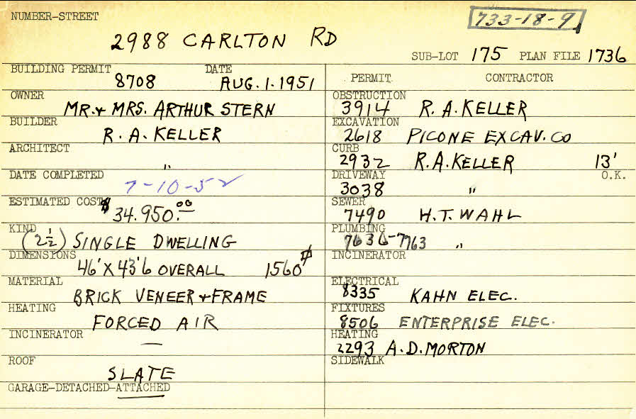 2988 Carlton Road Shaker Heights, OH 44122 PARCEL ID: 733-18-009 Building Permit Date: 08-01-1951 Plan File Number: 1736 scanned, 6342, 12678 Microfilm Roll: Roll26A, Roll#85, NewRoll#14 Neighborhood: Malvern Owner: Stern, Arthur Mr. and Mrs. Builder: Keller, Richard A. Architect: Keller, Richard A. Estimated Cost: 34950 Date Completed: 07-10-1952 Kind: Single 2-1/2 Material: Brick Veneer and Frame Heating: Forced Air Roof: Slate Garage: attached |