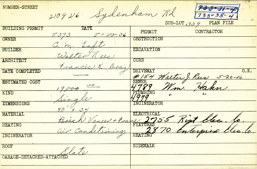 20926 Sydenham Road Shaker Heights, OH 44122 PARCEL ID: 733-35-004 Building Permit Date: 05-20-1936 Plan File Number: 91-107 Microfilm Roll: NewRoll#1 Neighborhood: Mercer Owner: Taft, C. M. Builder: Rees, Walter Architect: Draz, Francis K. Estimated Cost: 19000 Kind: Single, Single Residence or Dwelling Material: Brick Veneer and Frame Heating: Air Conditioned Roof: Slate |