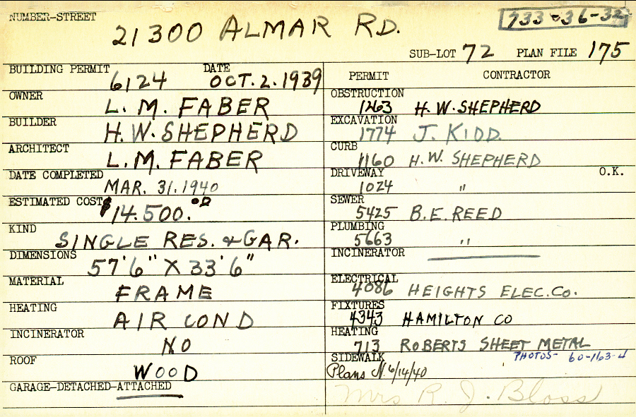 21300 Almar Drive Shaker Heights, OH 44122 PARCEL ID: 733-36-032 Building Permit Date: 10-02-1939 Plan File Number: 175, 7472 Microfilm Roll: Roll#93 Neighborhood: Mercer Owner: Faber, L. M. Builder: Shepherd, H. W. Architect: Faber, L. M. Estimated Cost: 14500 Date Completed: 03-31-1940 Kind: Single Dwelling and Garage Material: Frame Heating: Air Conditioned Roof: Wood Garage: attached |