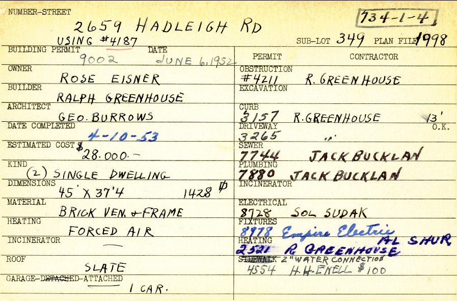 4187 Hadleigh Road Shaker Heights, OH 44118 PARCEL ID: 734-01-004 Building Permit Date: 06-06-1952 Plan File Number: 1998 Neighborhood: Mercer Owner: Eisner, Rose Builder: Greenhouse, Ralph Architect: Burrows, George Estimated Cost: 28000 Date Completed: 04-10-1953 Kind: Single, Single Residence or Dwelling (2) Material: Brick Veneer and Frame Heating: Forced Air Roof: Slate Garage: attached |