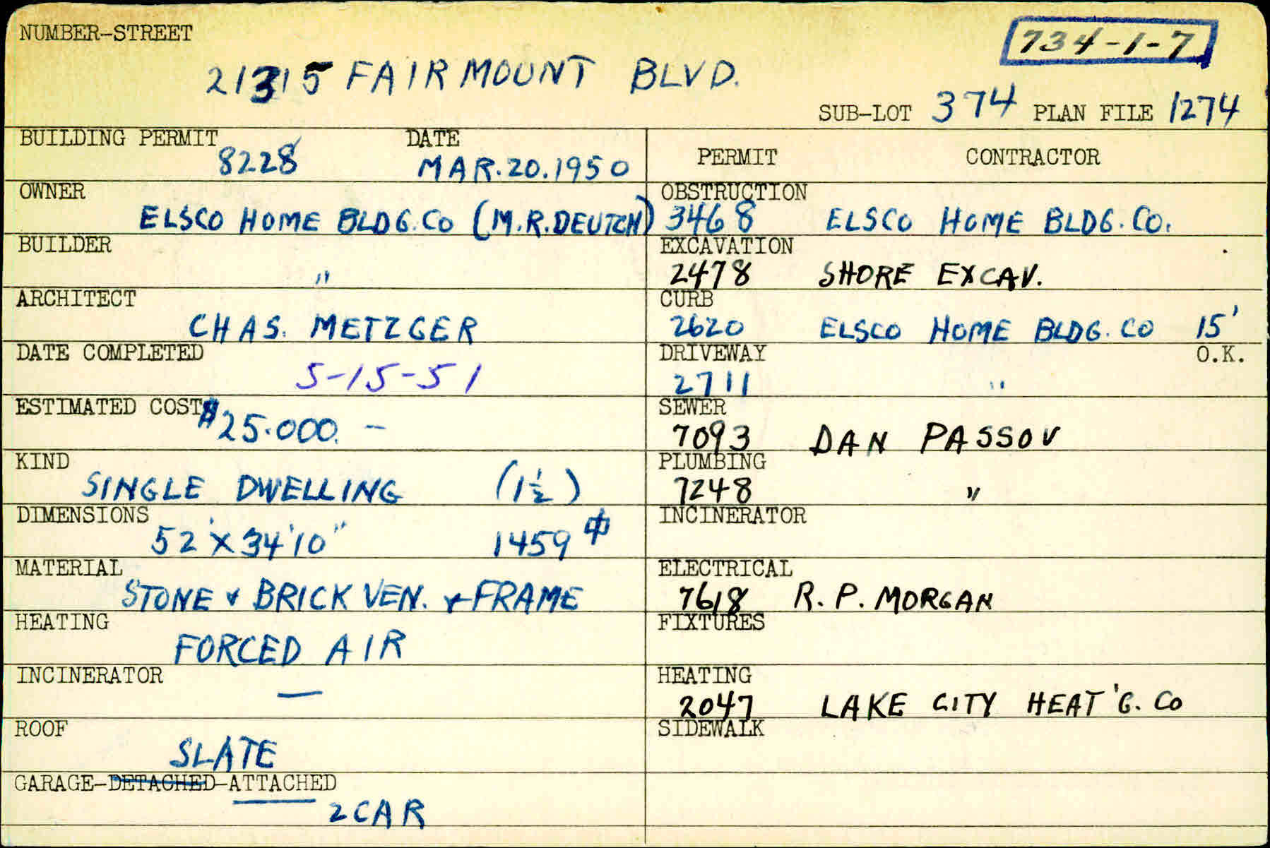 21315 Fairmount Boulevard Shaker Heights, OH 44122 PARCEL ID: 734-01-007 Building Permit Date: 03-20-1950 Plan File Number: 1274 all scanned Microfilm Roll: Roll015 Neighborhood: Mercer Owner: Elsco Home Bldg Co. (Deutch, M.R.) Builder: Elsco Home Bldg Co. (Deutch, M.R.) Architect: Metzger, Charles Estimated Cost: 25000 Date Completed: 05-15-1951 Kind: Single, Single Residence or Dwelling Material: Stone & Brick Heating: Forced Air Roof: Slate Garage: attached 2 car Card Available: Yes |