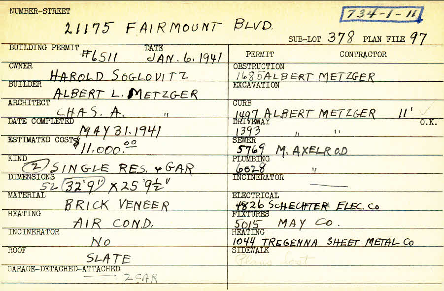 21175 Fairmount Boulevard Shaker Heights, OH 44122 PARCEL ID: 734-01-011 Building Permit Date: 01-06-1941 Plan File Number: 97, 4925, 9665 Microfilm Roll: Roll#68, Roll#104 Neighborhood: Mercer Owner: Soglovitz, Harold Builder: Metzger, Albert L. Architect: Metzger, Charles A. Estimated Cost: 11000 Date Completed: 05-31-1941 Kind: Single Dwelling and Garage (2) Material: Brick Veneer Heating: Air Conditioned Roof: Slate Garage: attached 2 car |