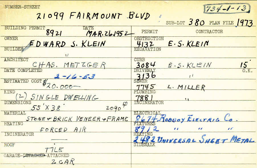 21099 Fairmount Boulevard Shaker Heights, OH 44122 PARCEL ID: 734-01-013 Building Permit Date: 03-26-1952 Plan File Number: 1014 scanned, 1973 Microfilm Roll: Roll012, Roll#29 Neighborhood: Mercer Owner: Klein, Edward S. Builder: Klein, Edward S. Architect: Metzger, Charles A. Estimated Cost: 20000 Date Completed: 02-16-1953 Kind: Single, Single Residence or Dwelling (2) Material: Stone and Brick Veneer and Frame Heating: Forced Air Roof: Tile Garage: attached 2 car |