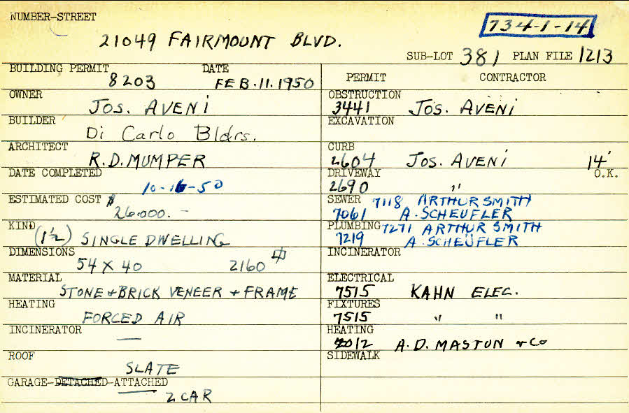 21049 Fairmount Boulevard Shaker Heights, OH 44122 PARCEL ID: 734-01-014 Building Permit Date: 02-11-1950 Plan File Number: 898, 1213 all scanned Microfilm Roll: Roll012, Roll014 Neighborhood: Mercer Owner: Aveni, Joseph Builder: DiCarlo Builders Architect: Mumper, R. D. Estimated Cost: 26000 Date Completed: 10-16-1950 Kind: Single, Single Residence or Dwelling Material: Stone and Brick Veneer and Frame Heating: Forced Air Roof: Slate Garage: attached 2 car |