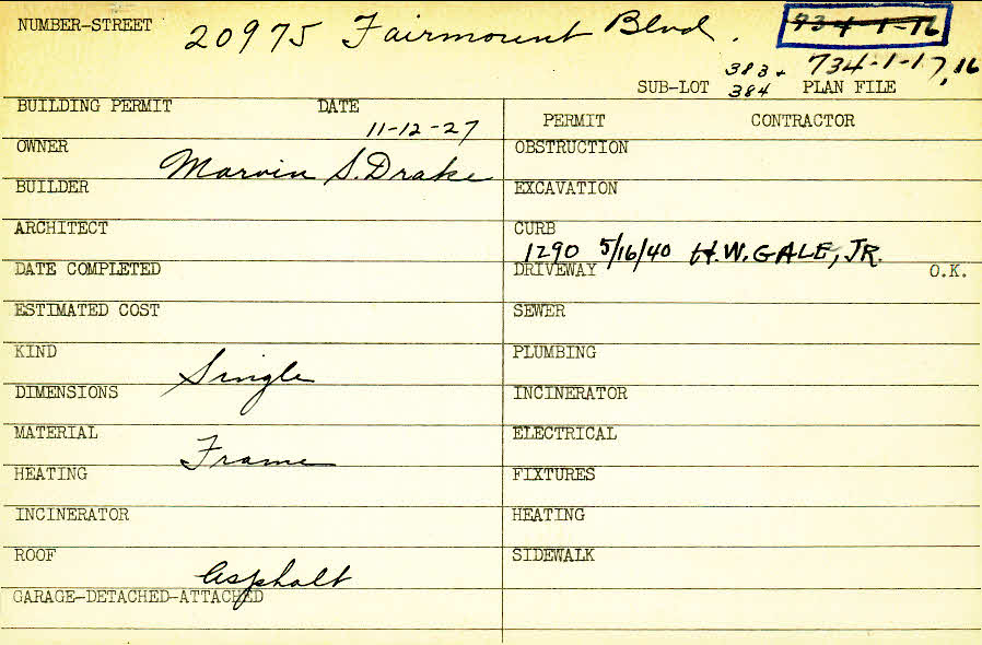 20975 Fairmount Boulevard Shaker Heights, OH 44122 PARCEL ID: 734-01-016 Building Permit Date: 11-12-1927 Plan File Number: 154 scanned, 688 scanned, 5428 Microfilm Roll: Roll001,Roll008, Roll#73 Neighborhood: Mercer Owner: Drake, Marvin S. Kind: Single, Single Residence or Dwelling Material: Frame Roof: Asphalt |
