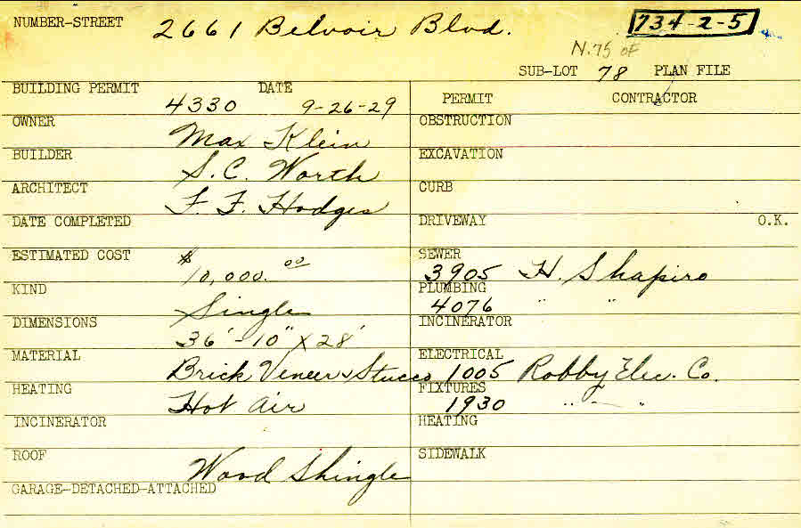 2661 Belvoir Boulevard Shaker Heights, OH 44122 PARCEL ID: 734-02-005 Building Permit Date: 09-26-1929 Plan File Number: 12452 Microfilm Roll: NewRoll#13 Neighborhood: Mercer Owner: Klein, Max Builder: Worth, S. C. Architect: Hodges, F. F. Estimated Cost: 10000 Kind: Single, Single Residence or Dwelling Material: Brick Veneer and Stucco Heating: Hot Air Roof: Wood Shingle |