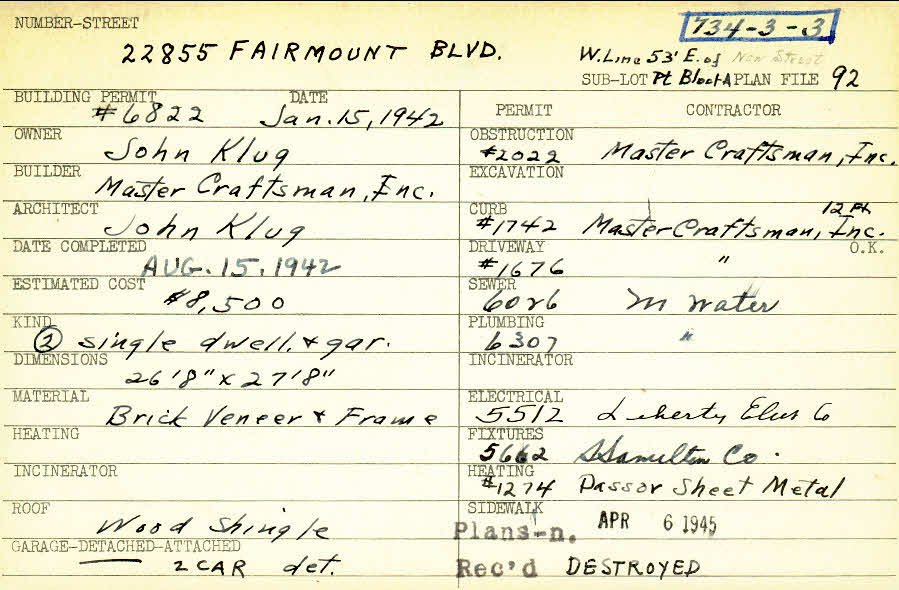 22855 Fairmount Boulevard Shaker Heights, OH 44122 PARCEL ID: 734-03-003 Building Permit Date: 01-15-1942 Plan File Number: 92, 5401, 6504 Microfilm Roll: Roll#73, Roll#86 Neighborhood: Mercer Owner: Klug, John Builder: Master Craftsman, Inc. Architect: Klug, John Estimated Cost: 8500 Date Completed: 08-15-1942 Kind: Single Dwelling and Garage (2) Material: Brick Veneer and Frame Roof: Wood Shingle Garage: detached 2 car |