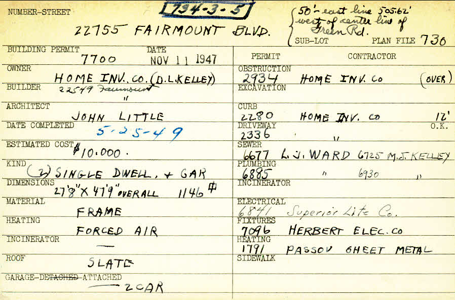 22755 Fairmount Boulevard Shaker Heights, OH 44122 PARCEL ID: 734-03-005 Building Permit Date: 11-11-1947 Plan File Number: 730 all scanned Microfilm Roll: Roll010 Neighborhood: Mercer Owner: Home Investment Company (D. L. Kelley) Builder: Home Investment Company Architect: Little, John W. Estimated Cost: 10000 Date Completed: 05-25-1949 Kind: Single Dwelling and Garage (2) Material: Frame Heating: Forced Air Roof: Slate Garage: attached 2 car |