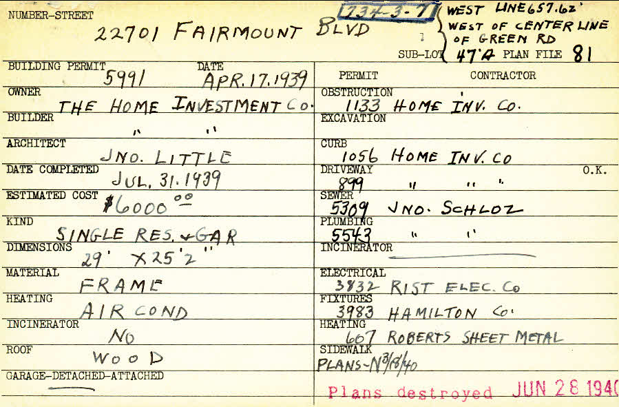 22701 Fairmount Boulevard Shaker Heights, OH 44122 PARCEL ID: 734-03-007 Building Permit Date: 04-17-1939 Plan File Number: 580 all scanned Microfilm Roll: Roll007 Neighborhood: Mercer Owner: The Home Investment Company Builder: The Home Investment Company Architect: Little, John W. Estimated Cost: 6000 Date Completed: 07-31-1939 Kind: Single Dwelling and Garage Material: Frame Heating: Air Conditioned Roof: Wood Garage: detached |